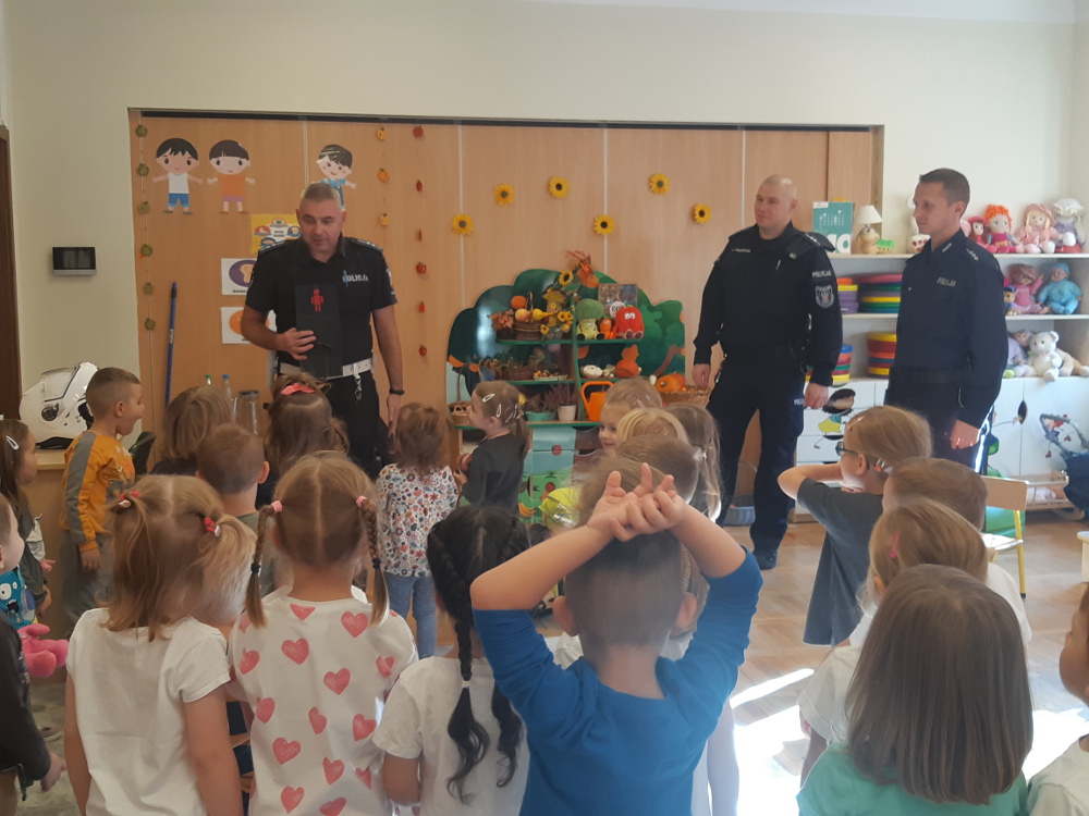 Mając na uwadze wspólny cel, czyli bezpieczeństwo dzieci, policjanci prowadzą pogadanki z najmłodszymi. Profilaktyka jest bardzo ważna od najmłodszych lat i procentuje w przyszłości. Każde spotkanie jest bardzo ciekawe, zarówno dla dzieci jak i dla funkcjonariuszy. Dzielnicowi z Woli aspirant Łukasz Tomaszewski i starszy aspirant Marcin Matuszewski odwiedzili dzieci z Przedszkola nr 134. Policjanci wraz z aspirantem Arturem Jaguszewskim ze stołecznej profilaktyki Wydziału Ruchu Drogowego przeprowadzili pogadankę na temat bezpiecznych zachowań, przedstawili zasady bezpiecznego poruszania się po drogach oraz dużą uwagę zwrócili na kontakt z obcą im osobą.