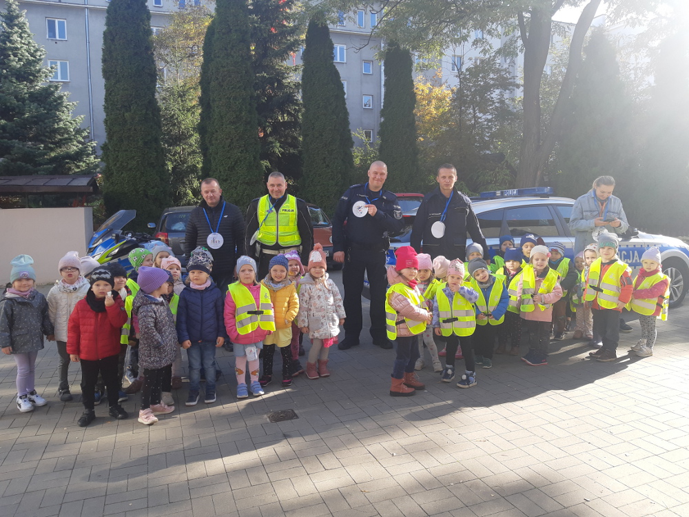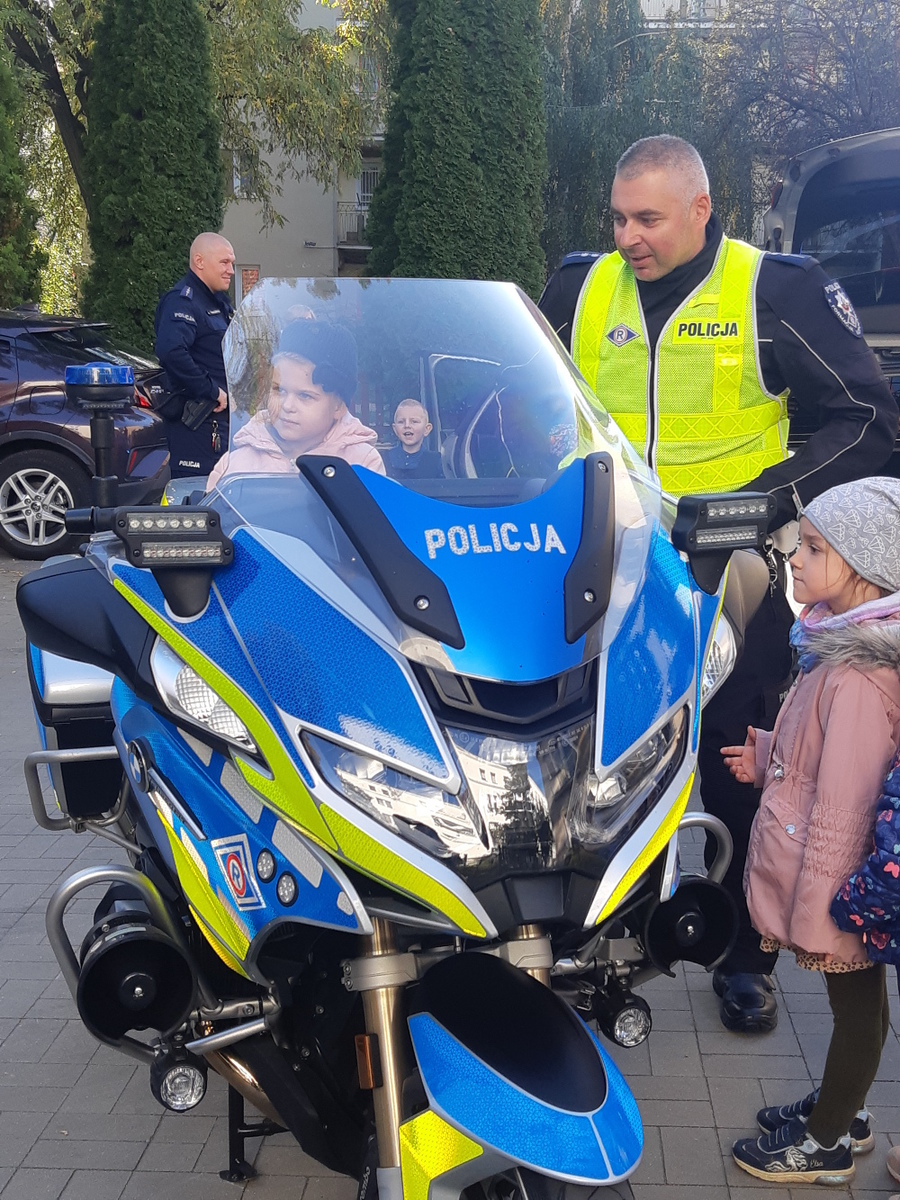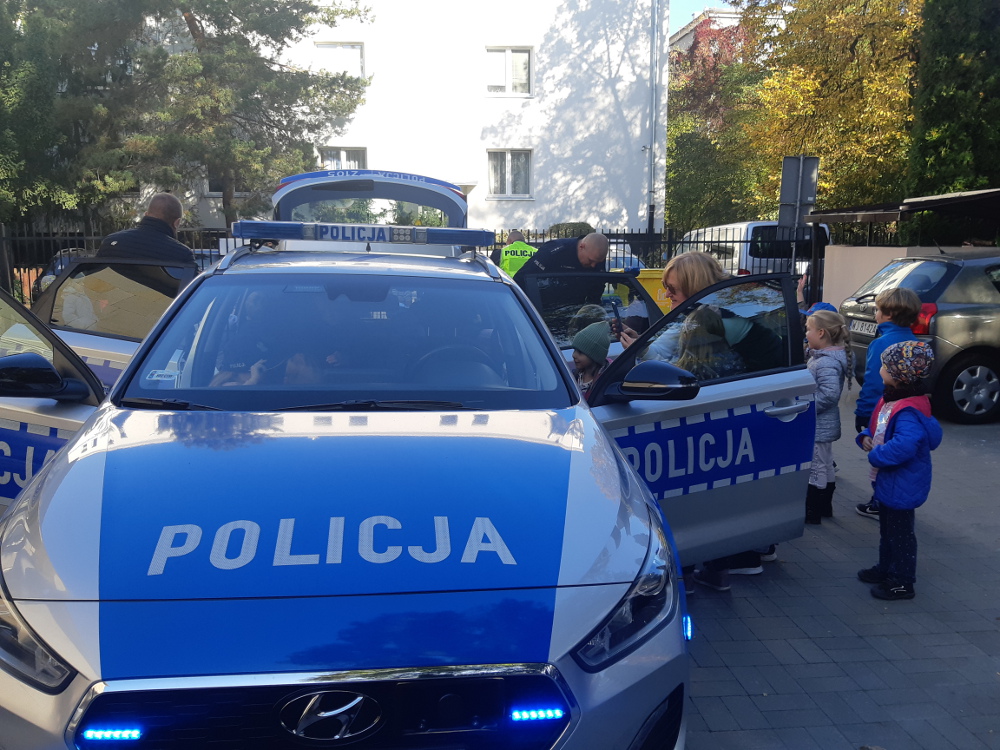 Policjanci przypomnieli informację między innymi o numerach alarmowych i zachęcali także najmłodszych do używania elementów odblaskowych. Dzieci miały również okazję dowiedzieć się na czym polega praca policjanta, jak wygląda jego mundur oraz jaki sprzęt jest potrzebny policjantom podczas służby. Największą uwagę dzieci zwrócił policyjny motocykl i radiowóz. W spotkaniu uczestniczyli przedstawiciele wolskiej delegatury Biura Bezpieczeństwa i Zarządzania Kryzysowego, którzy przekazali przedszkolakom kamizelki odblaskowe. Policjanci i przedstawiciele wolskiej delegatury otrzymali od dzieci i pracowników Przedszkola przygotowane odznaki oraz narysowane przez dzieci rysunki. Bardzo dziękujemy!