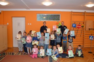 Przedszkolaki wykazały się ogromna wiedzą i celująco zdali egzamin, otrzymując z rąk policjantów swoje pierwsze „Prawo jazdy Przedszkolaka”. Uwieńczeniem tego spotkania z policjantami było wspólne zdjęcie.